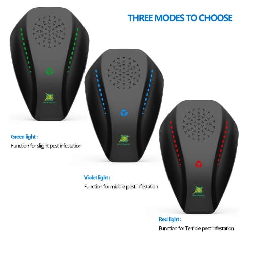 This flagship model features three adjustable settings—Green for minor, Blue for moderate, and Red for severe infestations—to effectively target rodents and insects using varying ultrasonic frequencies.